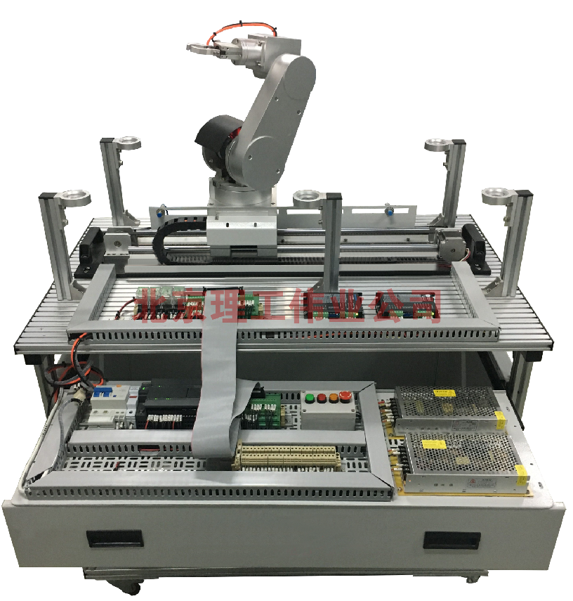 電氣控制部分包含漏電保護器、PLC、機器人控制器、步進(jìn)電機及驅動(dòng)器、空心杯電機、直流減速電機、蝸輪蝸桿、伺服電機、光電編碼器、電感傳感器、霍爾傳感器、開(kāi)關(guān)電源、操作盒(黃、綠、紅及急??刂瓢粹o)等組成,其中PLC(三菱采用FX3GA-24MT-CM<FX1N-24MT-001的升級版>\西門(mén)子采用CPU ST20,用戶(hù)可以選擇配置),通過(guò)傳感器信號采集,PLC編程對五自由度機器人進(jìn)行位置控制、時(shí)序邏輯控制,實(shí)現對機器人在工作臺面范圍內物體抓取、移、放的功能。